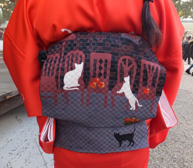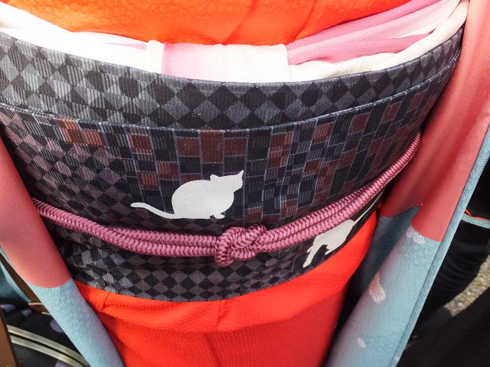 帯は2年ぶりの登場です。着付けを習い始めた頃、初めて買った記念の猫帯。一応正絹なのです。