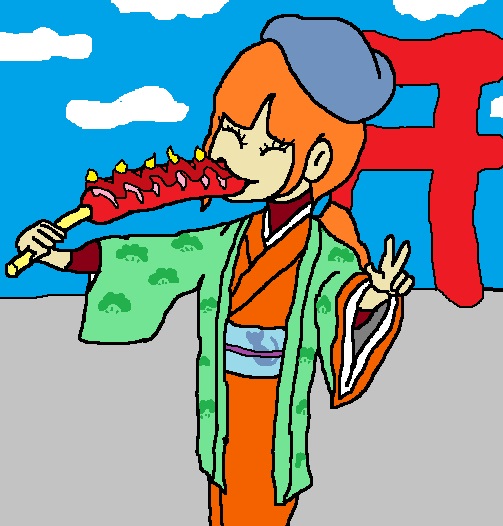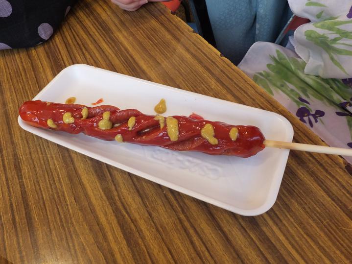 た~は自由自由が着物だと、わざと鮎の塩焼きとかフランクフルトとか買ってきます。