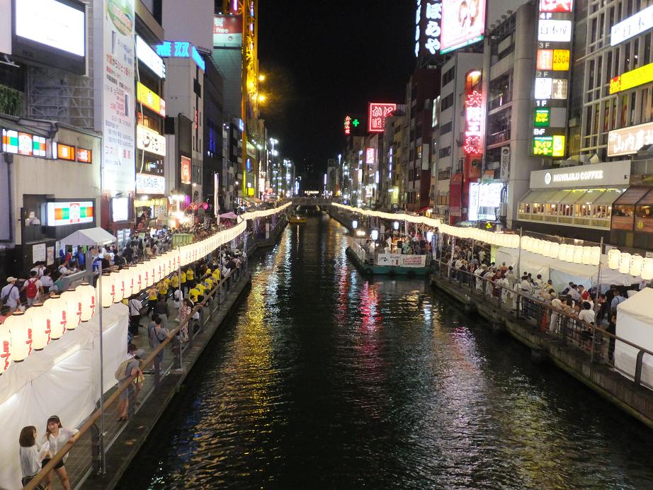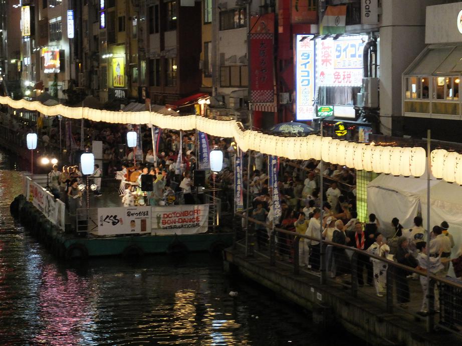 道頓堀川の上では盆踊りならぬ盆ダンスをみんな踊っていました。