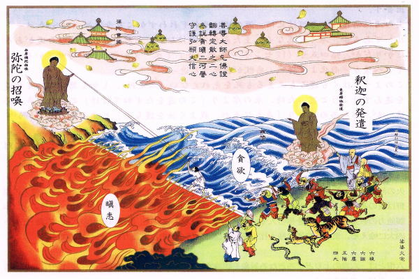 右の河は水が荒れ狂い、左の河は火が燃え盛っていて渡れそうにありません。でも後ろから追手が来るのです。そしたら二つの流れの間に細い白い道が現れ、そこを通ると無事、対岸(西岸)の極楽浄土に渡れるという教えだそうです。