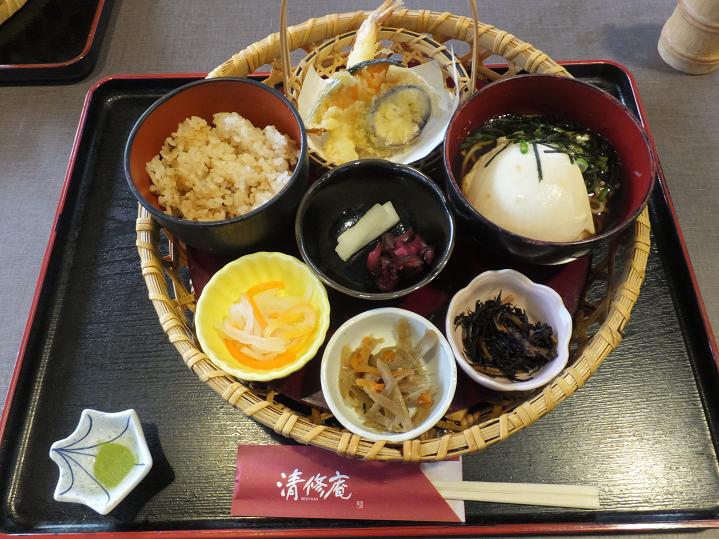 可愛い篭にはいった「豆腐そば膳」。天ぷらもついてるよ。![]()