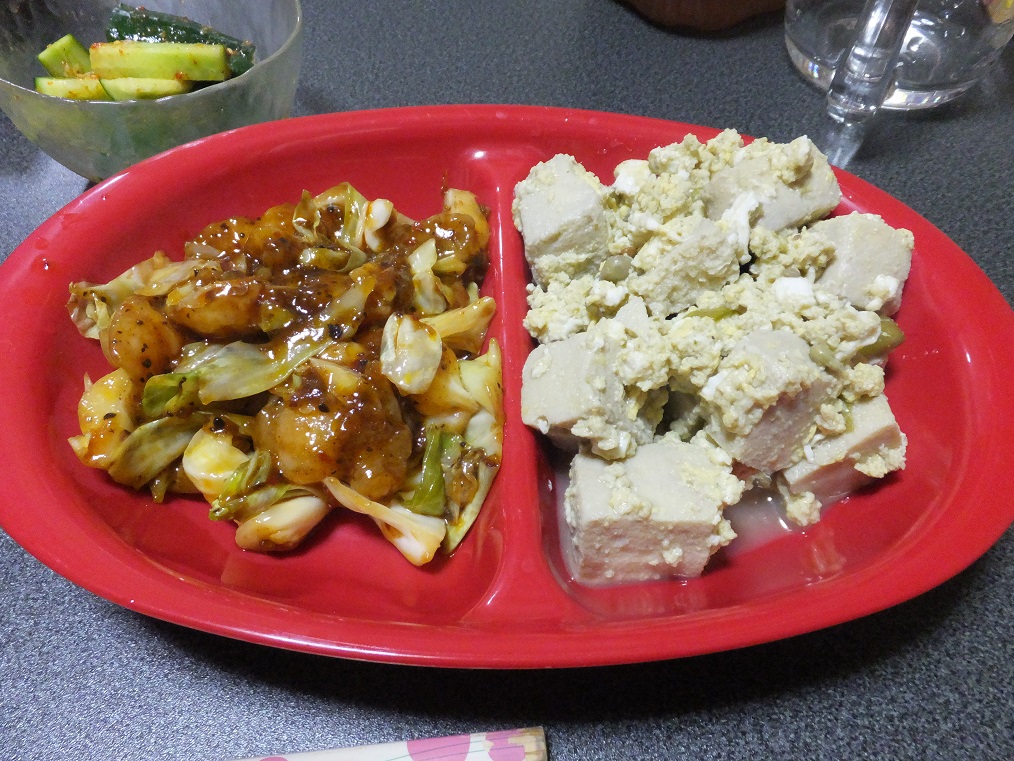 高野豆腐と絹さやの卵とじと、海老とキャベツの香味炒め