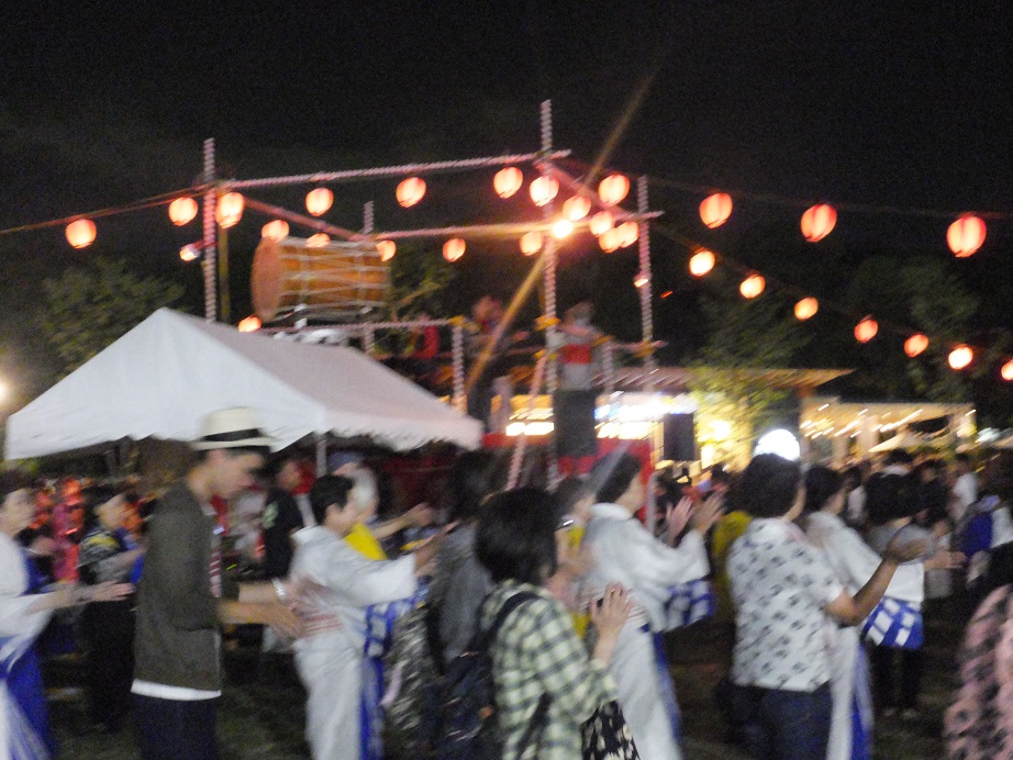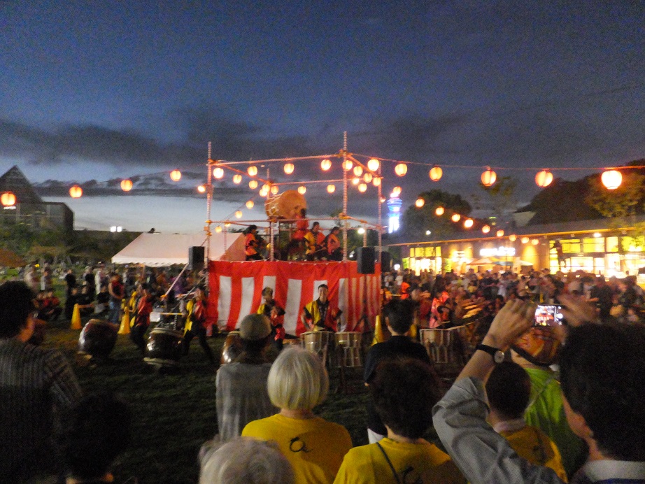 最初に女子高校生の太鼓のパフォーマンスがあって、盆踊りの開始です。