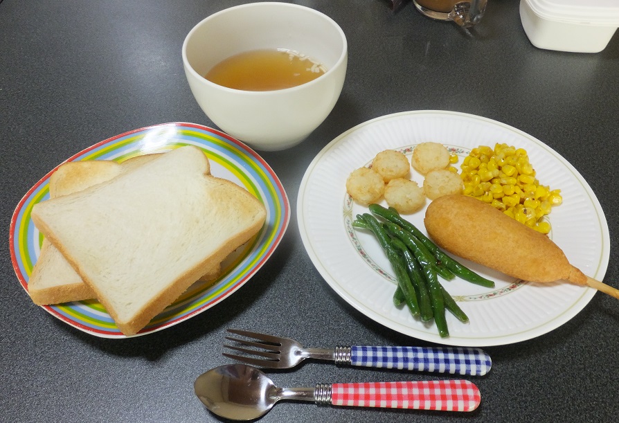 トーストにウインナーに卵焼きにミニ・チキンナゲトにサラダ with ポタージュ。