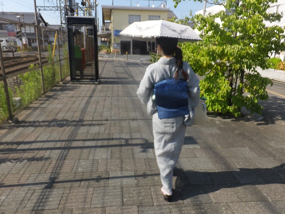 帯も同じくお祖母ちゃんの青い絽の名古屋帯を締めました。