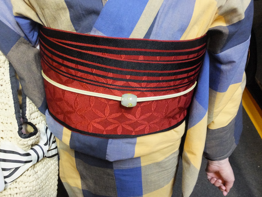 帯が暑苦しい色なので、レモン色のトンボ玉の二部紐を結んでみました。