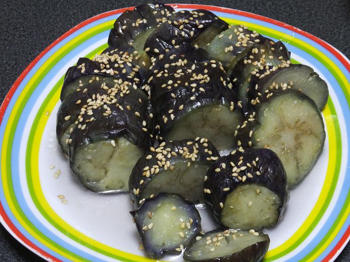 胡麻をまぶして光り輝く、茄子のおひたし一夜漬け