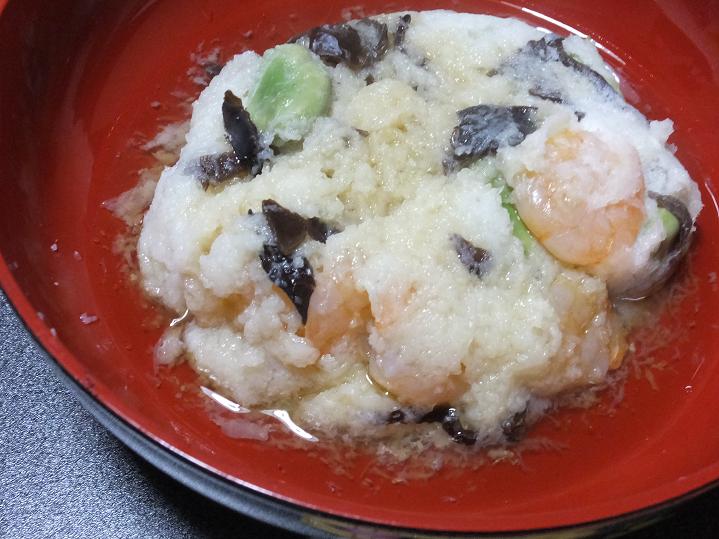 大根をすり下ろし、湯どうしした具に酒小さじ1をかけレンジで加熱。大根とメレンゲをふんわり混ぜ合わせて、具を混ぜる。耐熱の容器にいれてラップをかけ電子レンジで4~5分チン。