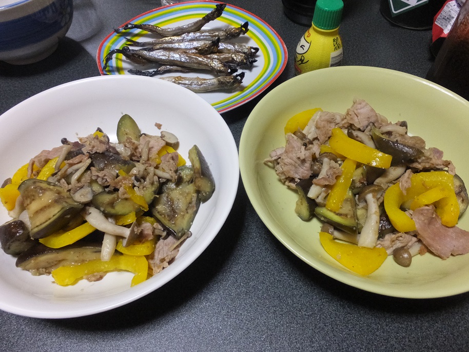 中身は豚肉に茄子にしめじ、黄パプリカ。