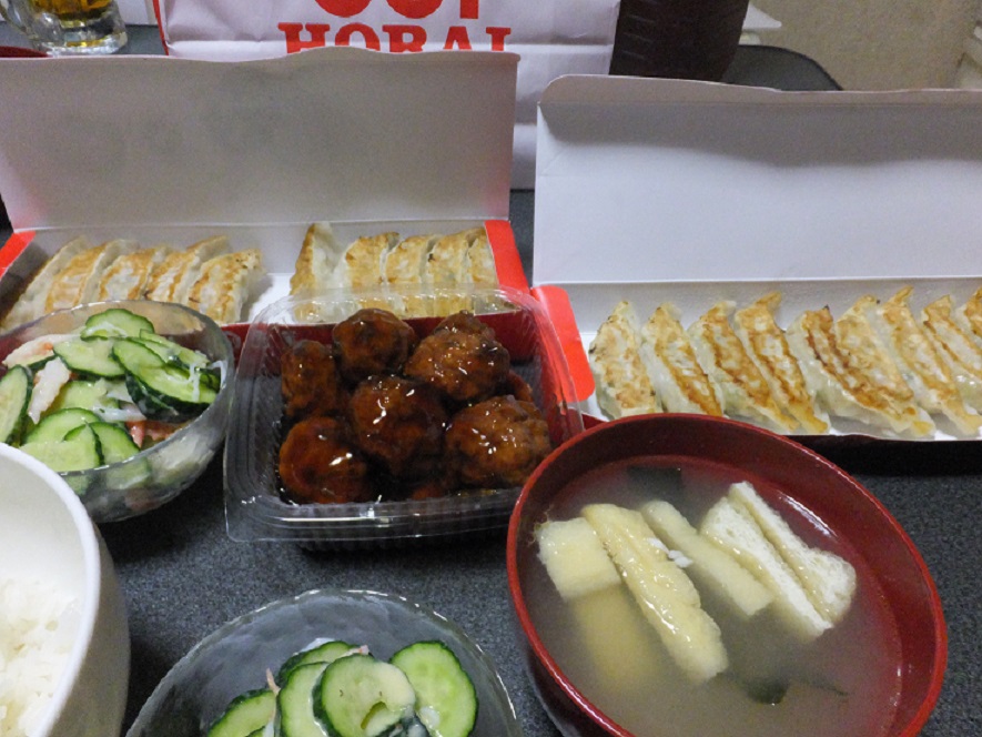 餃子20個に甘酢団子にサラダにお味噌汁です。