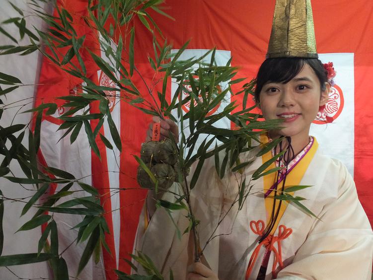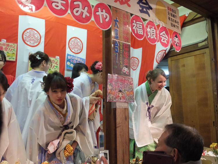 境内横でお兄さんから無料の福笹をもらって、早速福娘にお飾りをつけてもらいました。