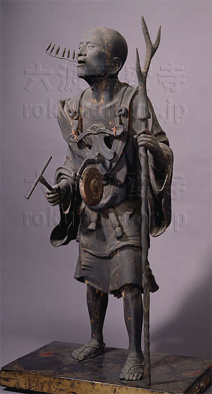 杖は鹿の角で口から出てるのは阿弥陀仏六体です。「南無阿弥陀仏」と唱えると、その言葉は仏となって口から出てくるのです。