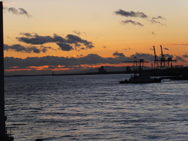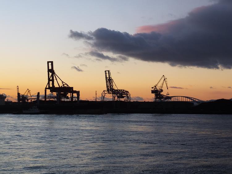 夕暮れのガントリークレーンのシルエットは哀愁があります。
