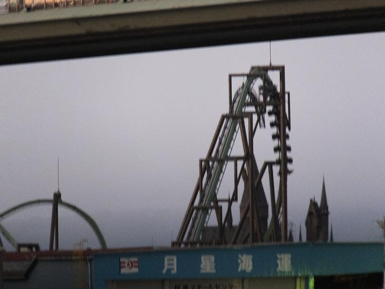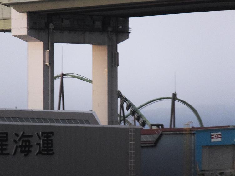 対岸に見えるUSJのコースター。フライイング・ダイナソーらしい。落ちるとこ。