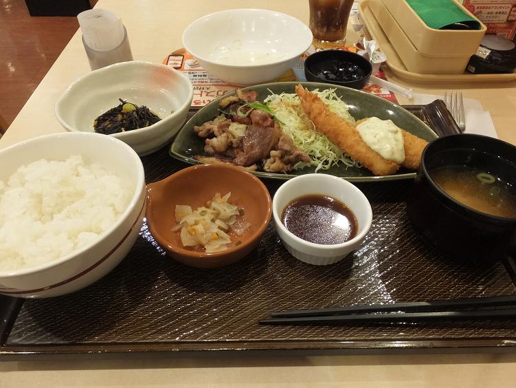 牛カルビ膳を注文。海老フライもついてる。