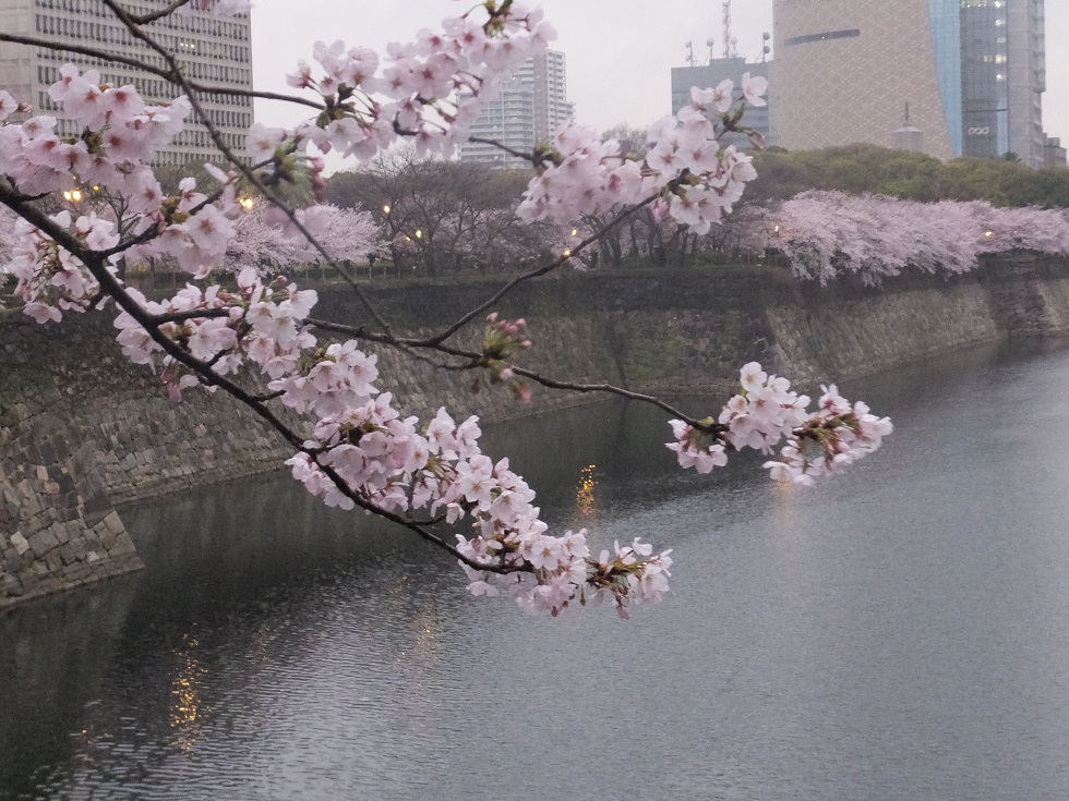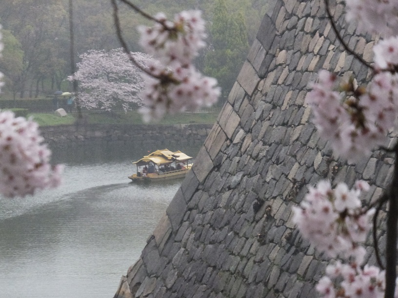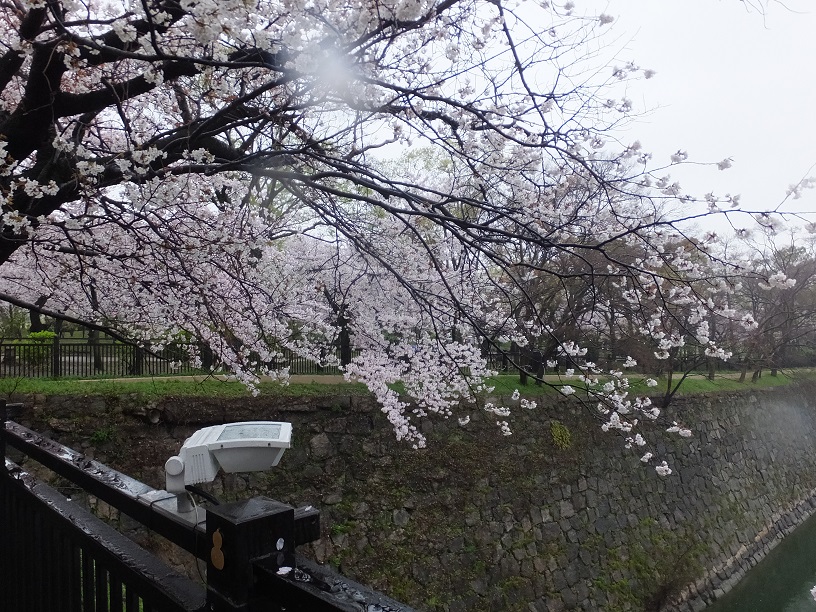 本丸を出ます。お掘りに垂れる桜。