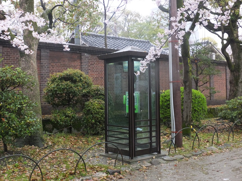 レンガの壁の前の桜の電話ボックス。