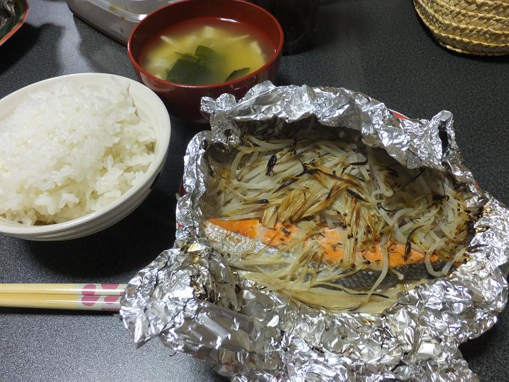 鮭の巣ごもり風ホイル焼き。(もやし入れすぎた)