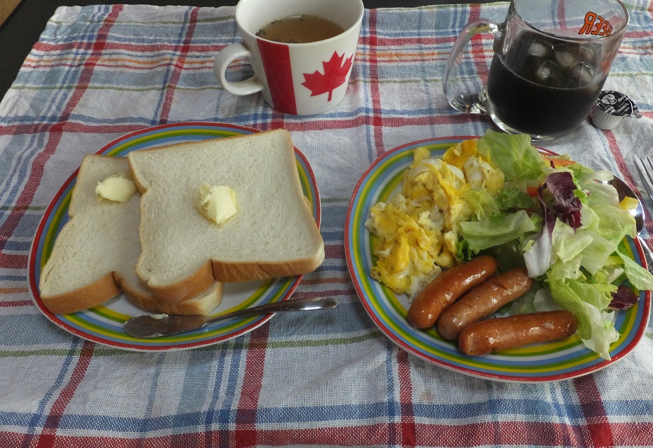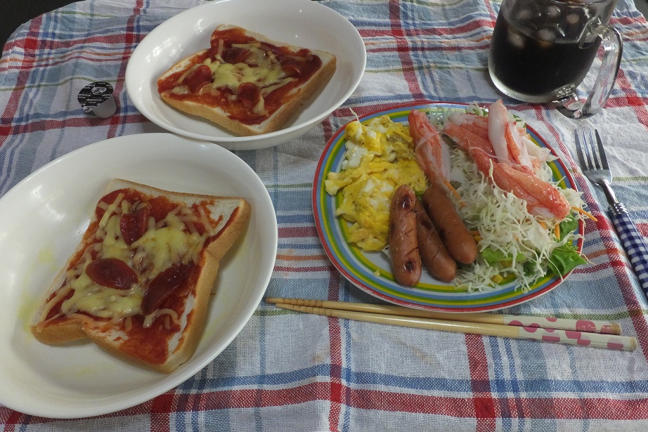 チーズトーストにソーセージとスクランブル・エッグ。なぜかカニかまも。