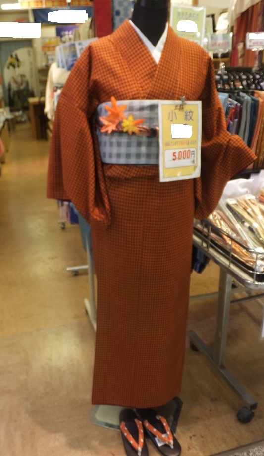 9月上旬は早くも紅葉を意識したオレンジの格子柄にグレー市松の半幅帯をコーデしてみました。