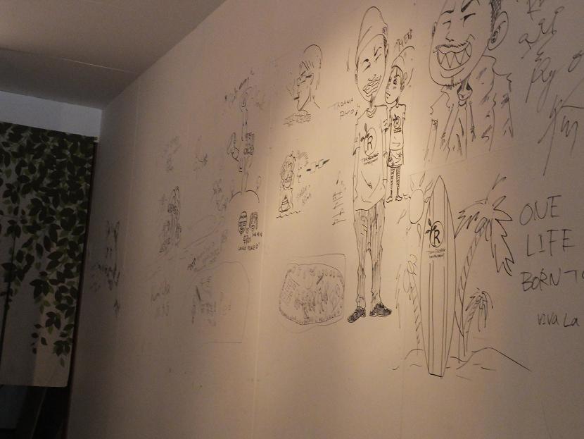 一階はこんな感じ 奥に大きなテーブル。白い壁には落書きのようなイラスト