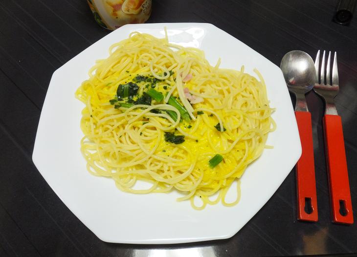 早速「濃厚チーズのカルボナーラ」を食べました。レンジで温めるだけなのですが、なんと!一袋に350gも入っているのです。