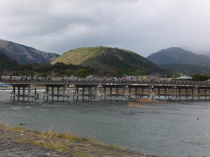 渡月橋(とげつきょう)です。真ん中のこんもりしたのは小倉山。