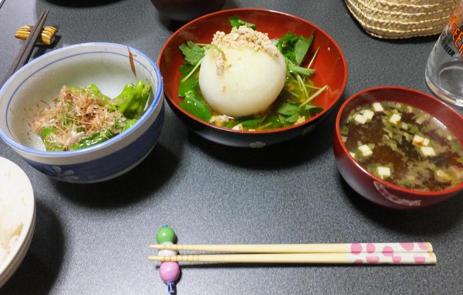 新玉ねぎのそぼろ煮とししとうのおひたし。