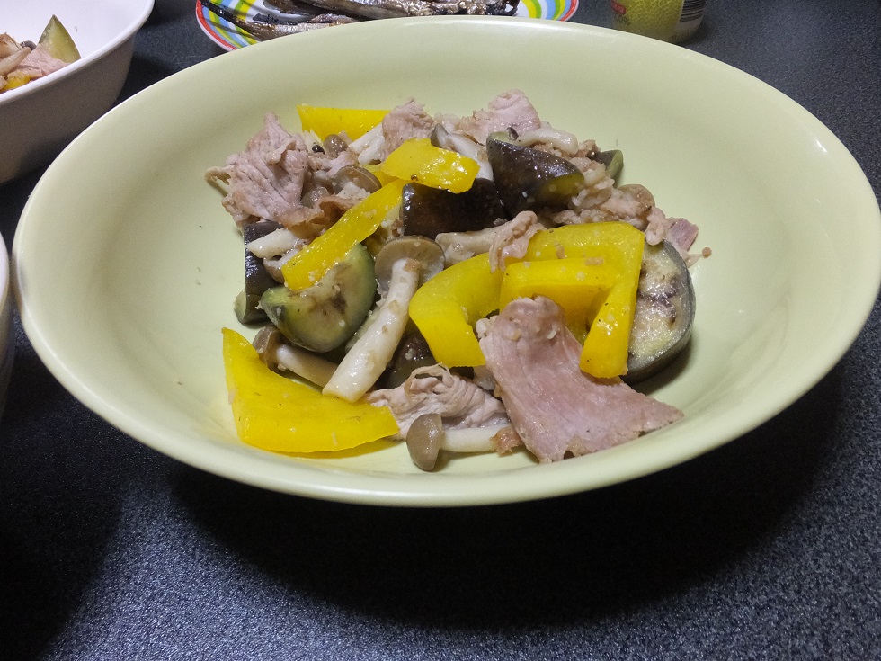 中身は豚肉に茄子にしめじ、黄パプリカ。